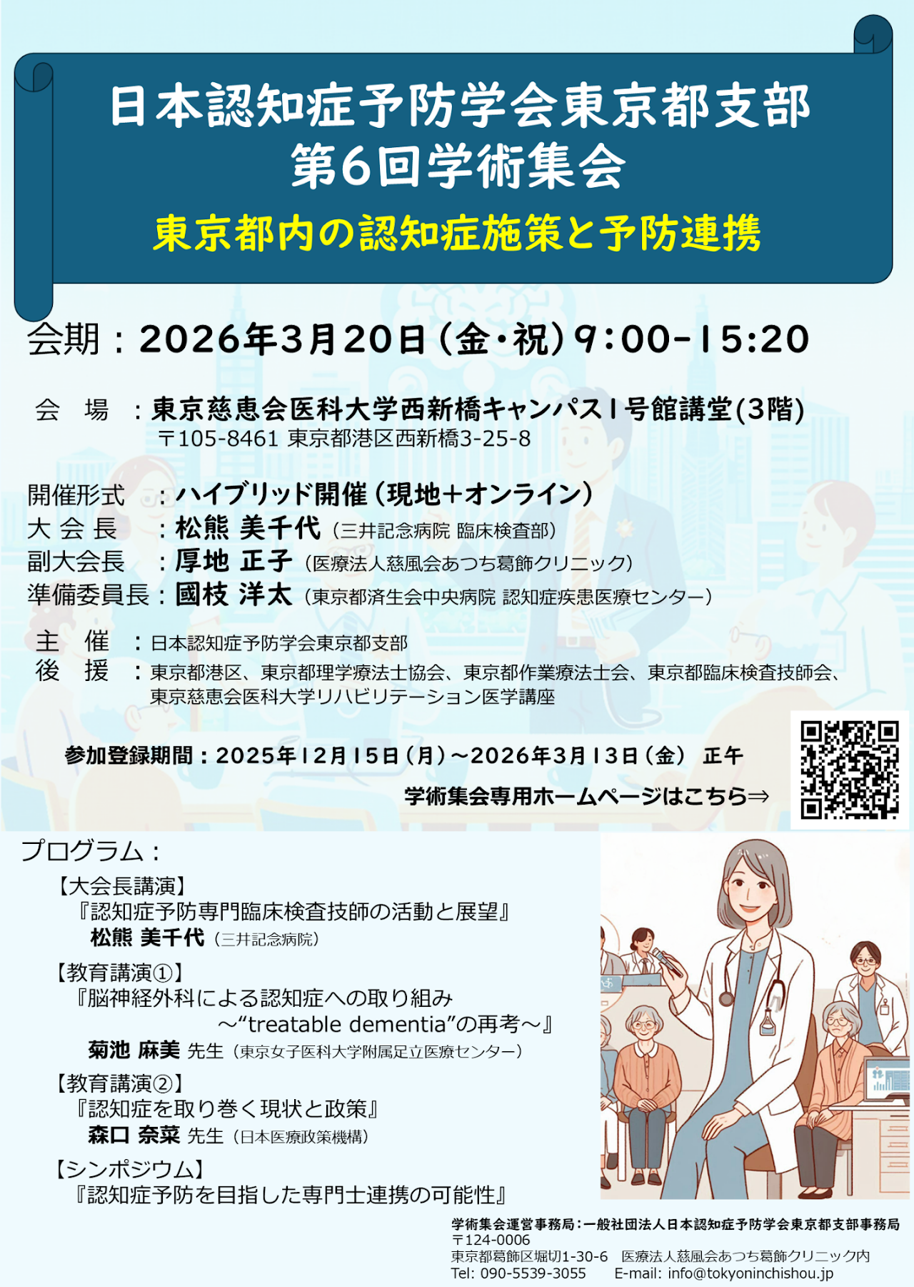 本学術集会は、「東京都内の認知症施策と予防連携」をテーマに、医療・研究・地域など多様な分野の専門職が認知症予防の取り組みについて議論する場として開催されます。
