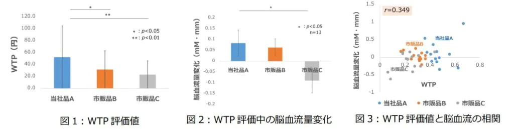 また、WTP検討中には、好ましいブランドを選択する際に活動が高まることが報告されている背内側前頭前野の脳血流が有意に上昇していました。生体・主観評価により商品価値の評価を定量化できる可能性があることが示されました。